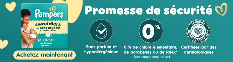 Pour les nouveau-nés, les couches Pampers Swaddlers sont dotées d’une doublure absorbante KeepDry™ qui emprisonne l’humidité et les salissures pour aider à maintenir une peau sèche et saine. Elles sont testées sous contrôle dermatologique, hypoallergéniques et exemptes de parfum, de chlore élémentaire, de parabènes et de latex* (*sans caoutchouc naturel), ce qui les rend adaptées à la peau délicate des nouveau-nés.